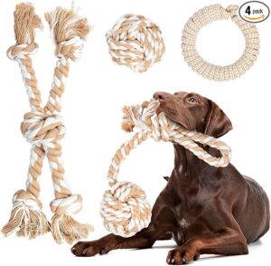 Things like braided rope toys, stuffed (or stuffing-free) fabric toys, and frozen towels can bring so much relief to teething pups.